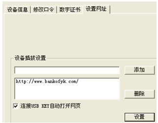 ②原因是沒有勾選自動(dòng)打開網(wǎng)頁。雙擊小黃鎖或者是我行EK圖標(biāo)——設(shè)置網(wǎng)址,進(jìn)入下圖畫面,將我行網(wǎng)址m.chenkunkeji.com添加入列表,勾選“連接USB KEY自動(dòng)打開網(wǎng)頁” ,且點(diǎn)擊設(shè)置。