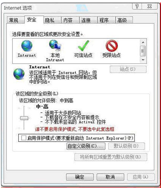 ?、苋绻莣in7或者是vista系統(tǒng),請關(guān)閉IE的保護(hù)模式,如下圖: